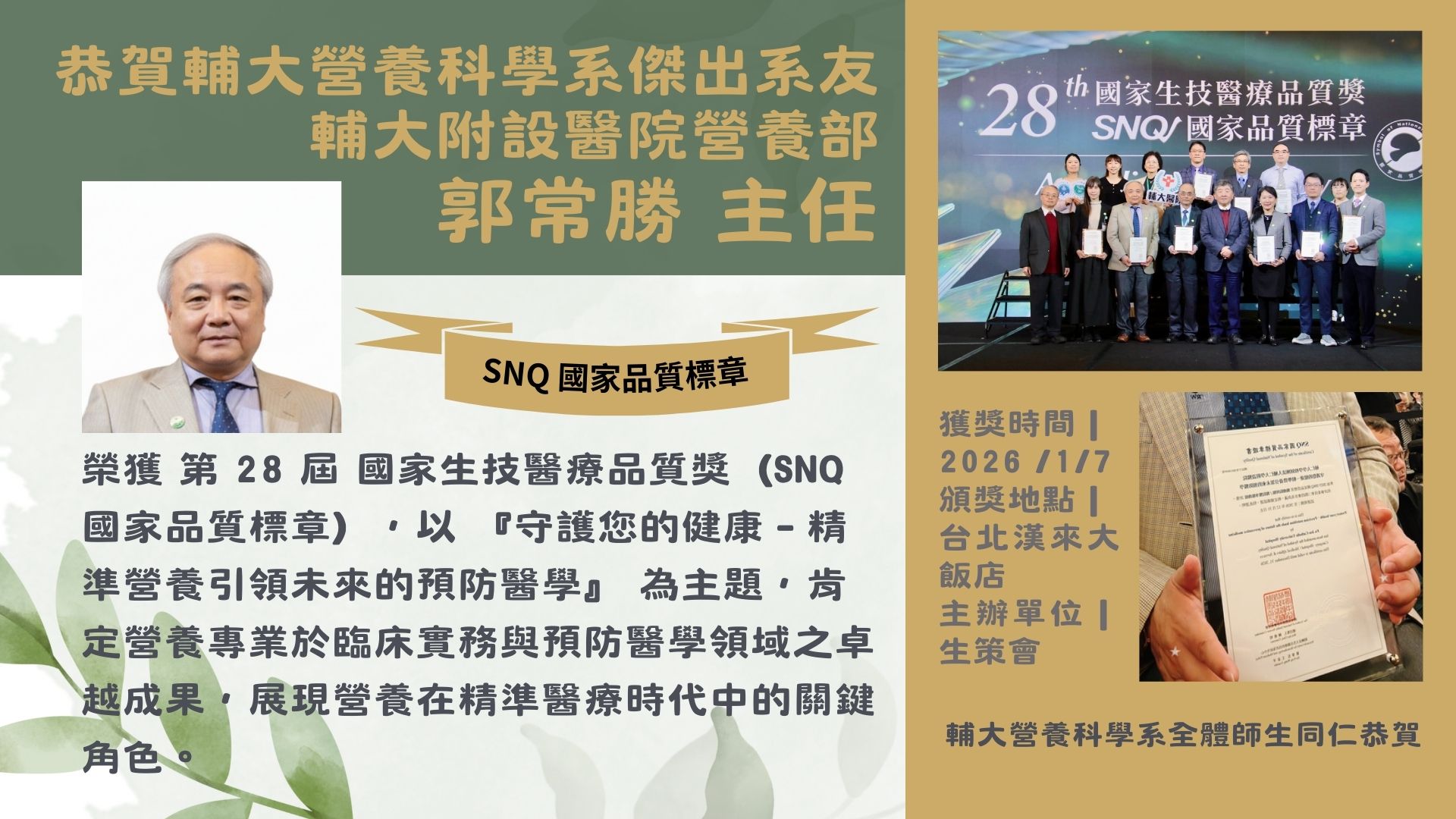 本系傑出系友、輔仁大學附設醫院營養部 郭常勝 主任,近日傳回捷報!郭主任帶領團隊以「守護您的健康-精準營養引領未來的預防醫學」為主題,榮獲 第 28 屆國家生技醫療品質獎(SNQ 國家品質標章)。此獎項肯定了營養專業在臨床實務與預防醫學領域的卓越貢獻,更展現了營養學在精準醫療時代中的關鍵角色。全體師生同仁聞訊倍感榮耀,誠摯恭喜郭主任,以專業守護大眾健康,成為本系學弟妹的最佳典範。 |