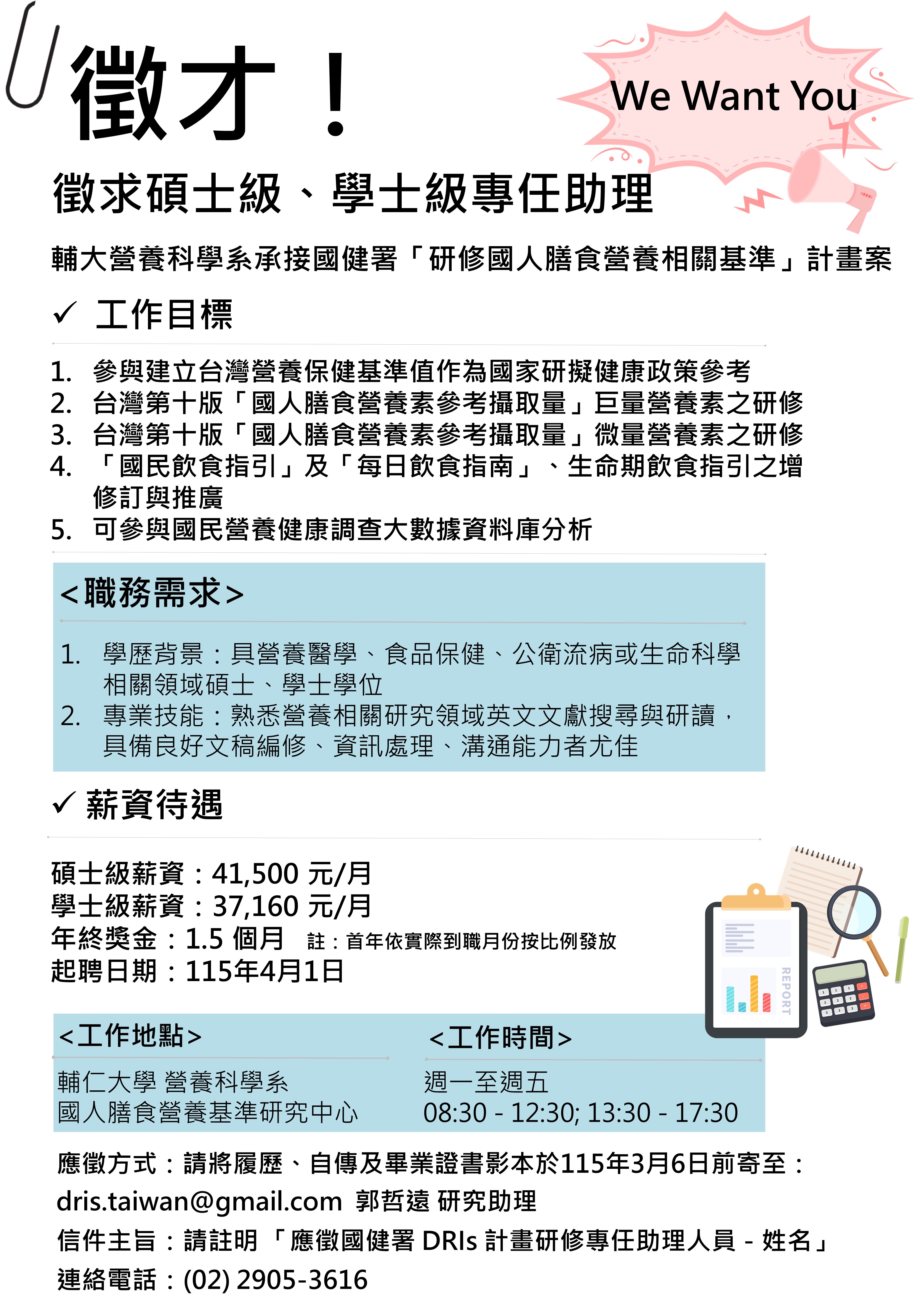 「研修國人膳食營養相關基準計畫」誠徵碩士級(2名)與學士級(1名)助理